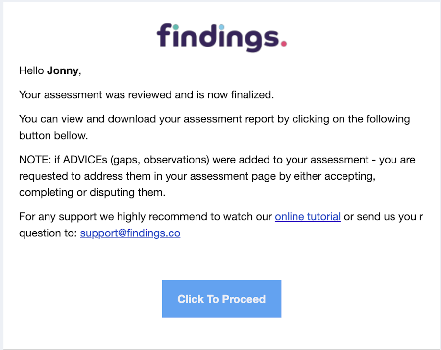 When you submit an assessment, the customer reviews your responses. Once they have finished their review, you will receive an email notification indicating as such. If there are any findings, you will need to review them.